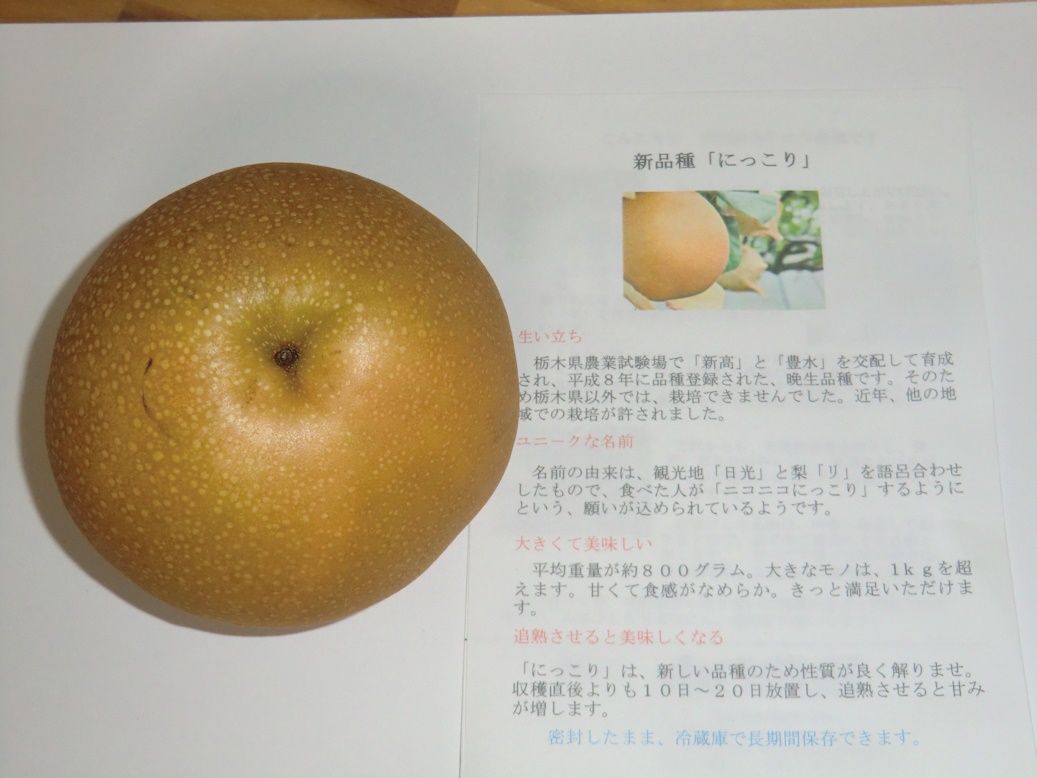 新しい品種で、平成8年に栃木県で新高と豊水を交配した品種だそうで、今年から埼玉でも栽培できるようになったそうです。