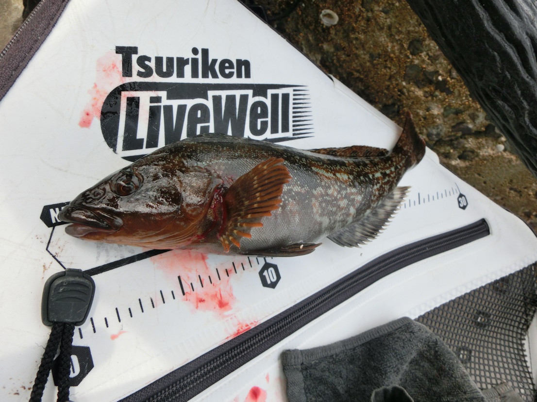 しかし 上滑りの潮で仕掛けの馴染みも悪くアタリもありませんでしたが、12時の音楽が鳴ると良い雰囲気になり先ずはこの30㎝に迫るアイナメを釣り上げました。