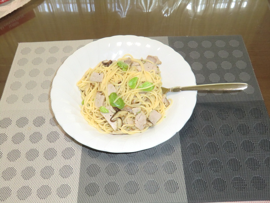 今日の昼飯は自家製のハムと先ほど収穫したそら豆でパスタにしました。