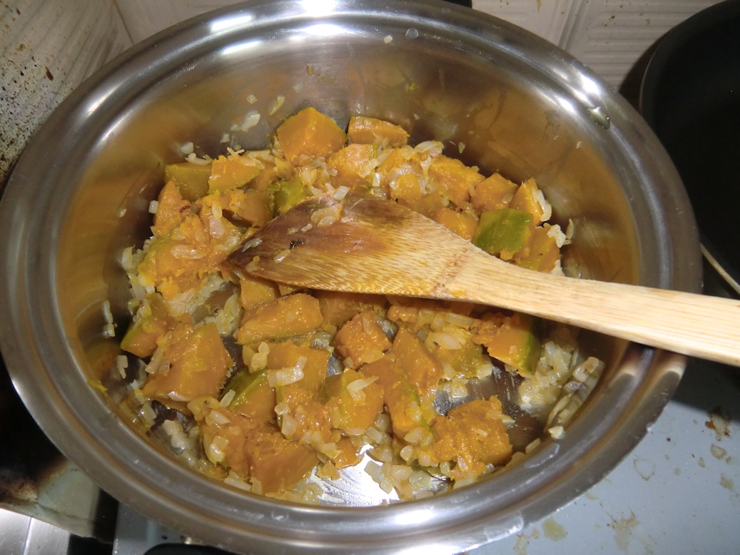 あめ色になったらレンジでチンしたカボチャを加えバターを馴染ませたら