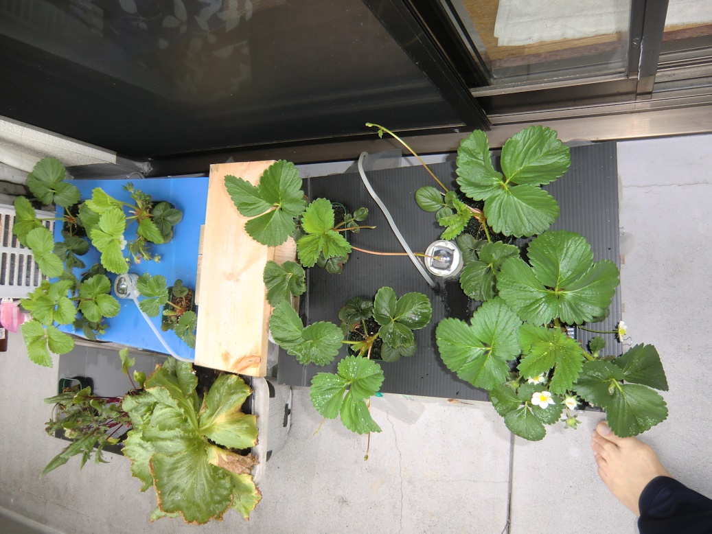 同じベランダにある水耕栽培の苺は、暖かくなった所為か青々と伸びてきました、果実も大きく