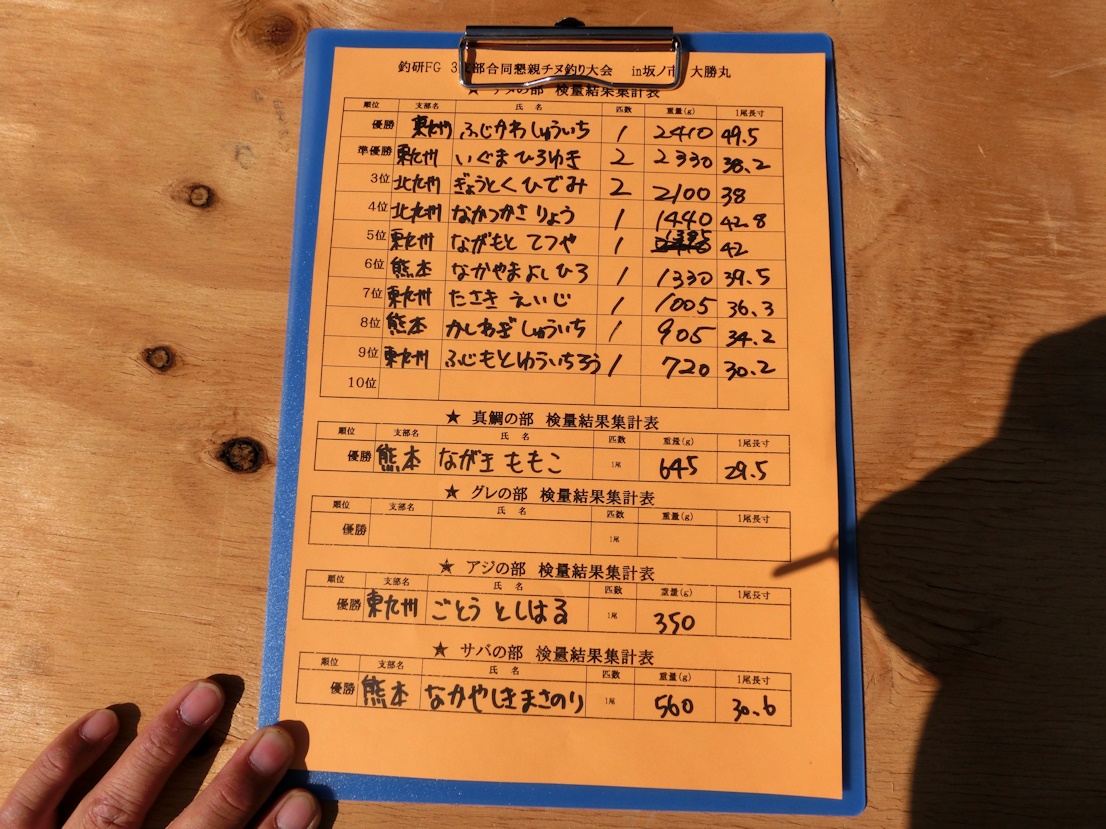 検量は2匹の質量で行われましたが、2匹検量したのは9名中2名でした、ただ 優勝は1匹の検量の東九州支部の方で49.5㎝で2.410gありました。
