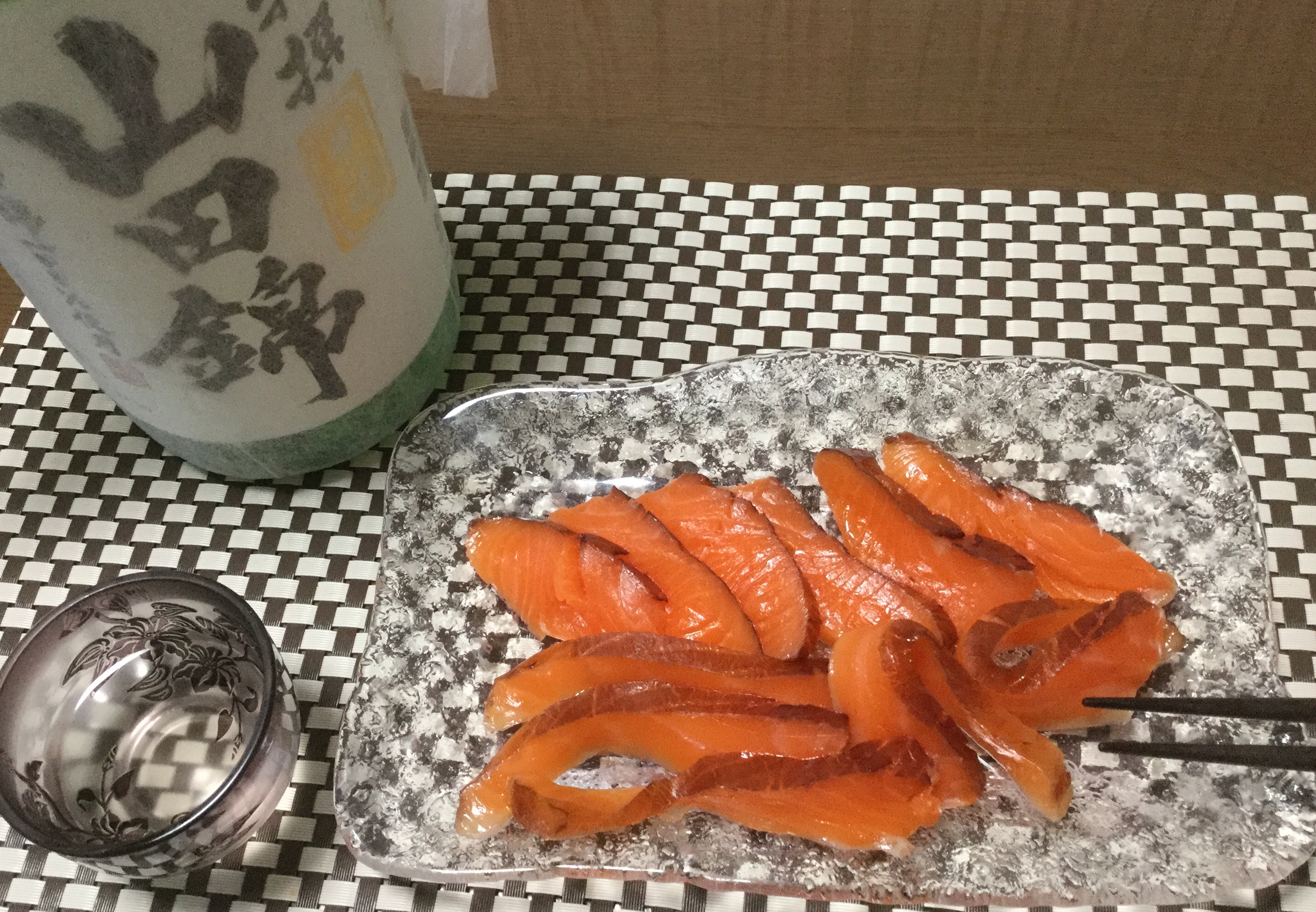昨日完成したソフトスモークサーモンを肴に山田錦を遣っています。