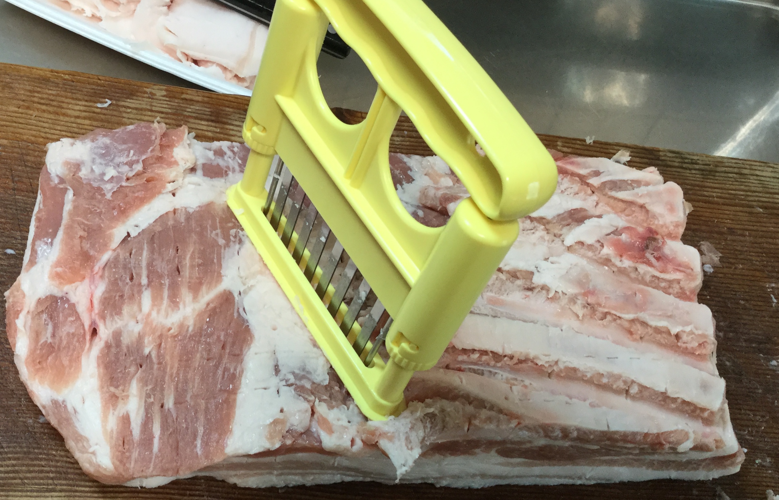 まず、余分な脂肪をとって、スパイスがよく馴染むように穴を開けます。