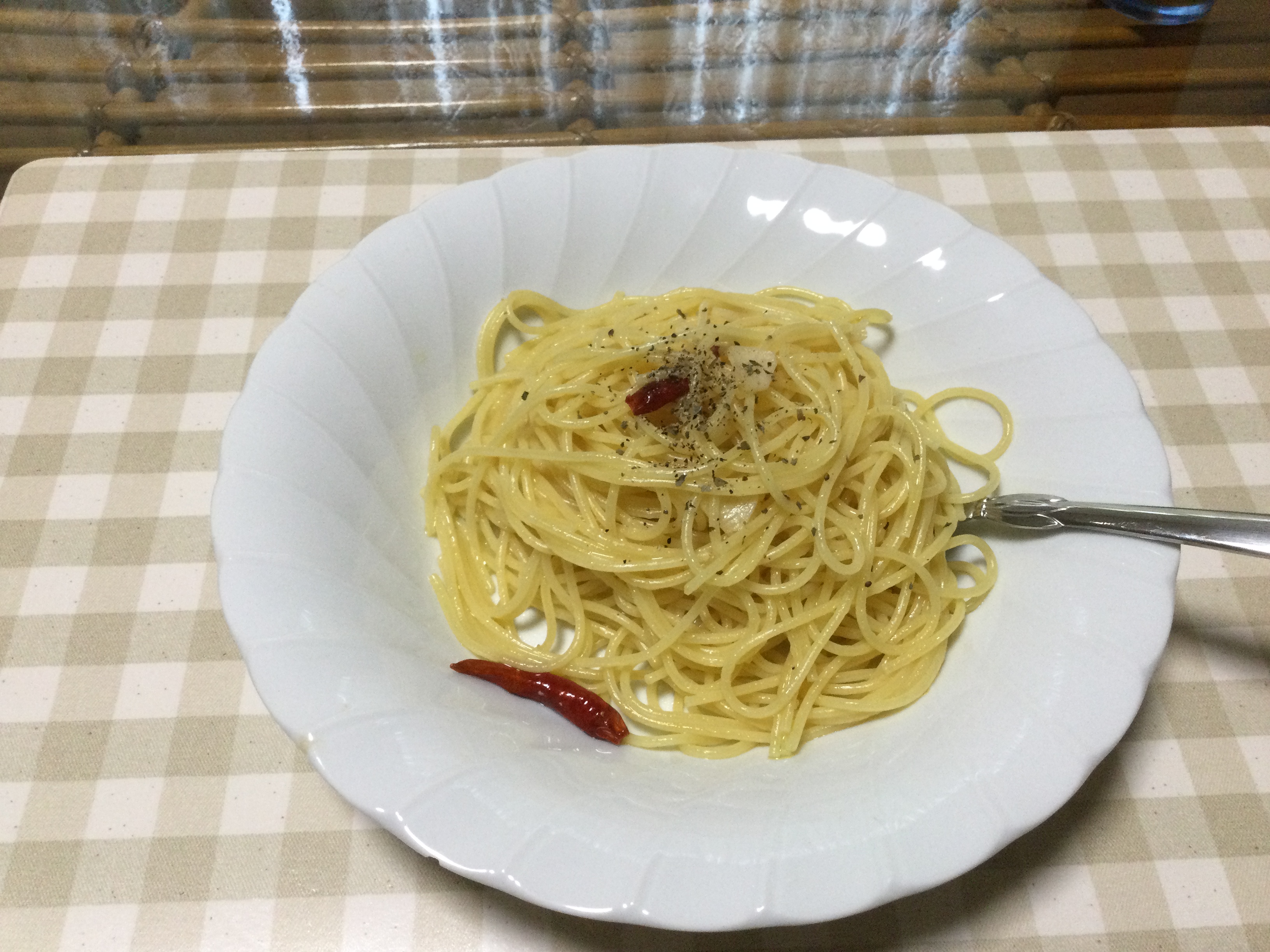 お昼はスパゲッティで一番簡単で一番難しいペペロンチーノでした。
