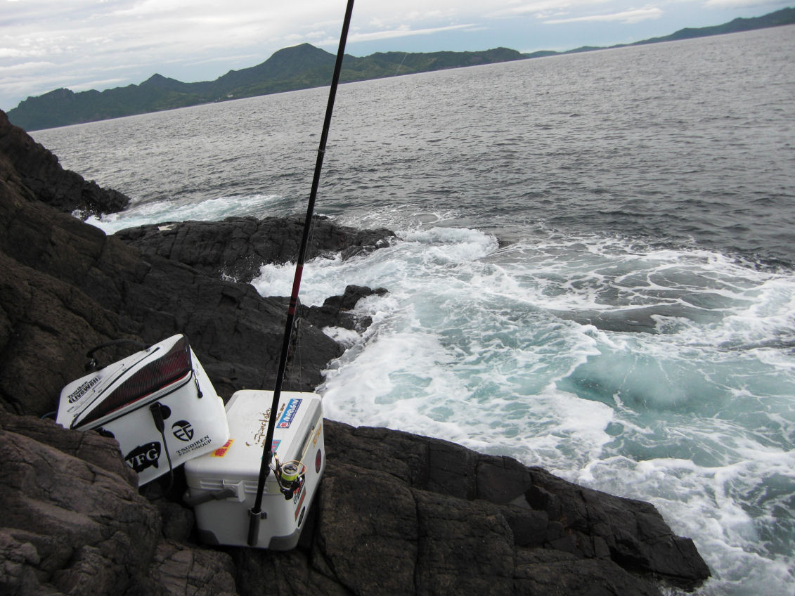 開始早々、一番右の釣り座に入った地元の方が良型を2匹釣り上げてリードしましたが、この頃からうねりが大きくなり長崎の方がバッカンを流され私も撒き餌ヒシャクを流され、釣りが出来る状態ではなくなりました。