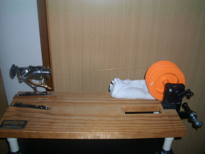 1週間以上釣りに行かない時は写真のようにオレンジのスプールに道糸を巻き取ります、巻き癖を出来るだけ付けないようにする為です。 巻き取る時はついでに、濡れタオルで塩分をふき取りながら巻き取っていきます。リールに巻き取る時は写真のようにタオルを挟んで、負荷を掛けて巻き取ります。これでかなりの巻き癖が軽減されます。