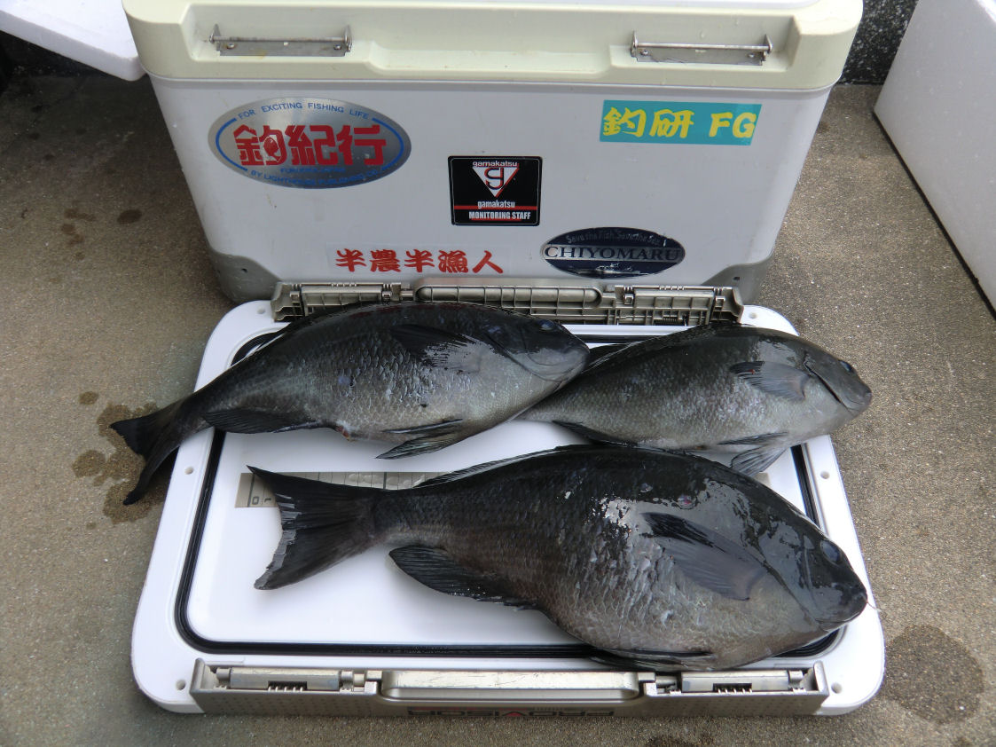 2匹目は35cmの尾長でタモが届かず波に乗せて上の段までずり上げて、そこから斜面を引きずり上げようとしたらハリスが切れて危うく逃げられる所でしたが、慌ててタモで押さえて波が来た時にうまくタモの中に納まってくれました。
