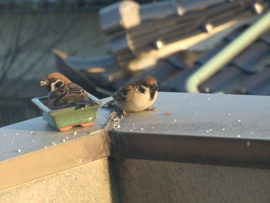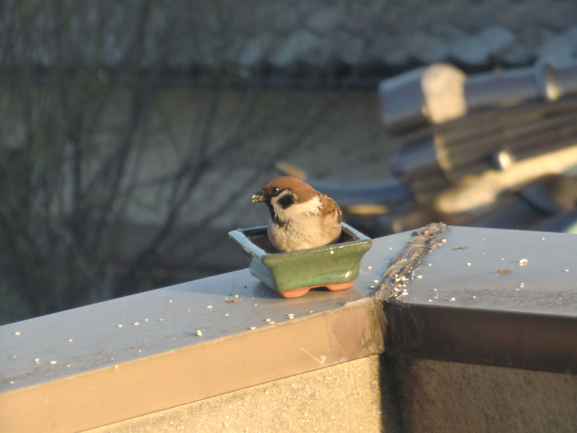 ミニ盆栽の鉢につり用の小麦を入れてベランダの手すりの上に置いていたら
