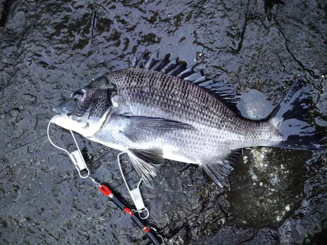 上阿値賀のうらの瀬でチヌ釣りです。 2投目で来ました。