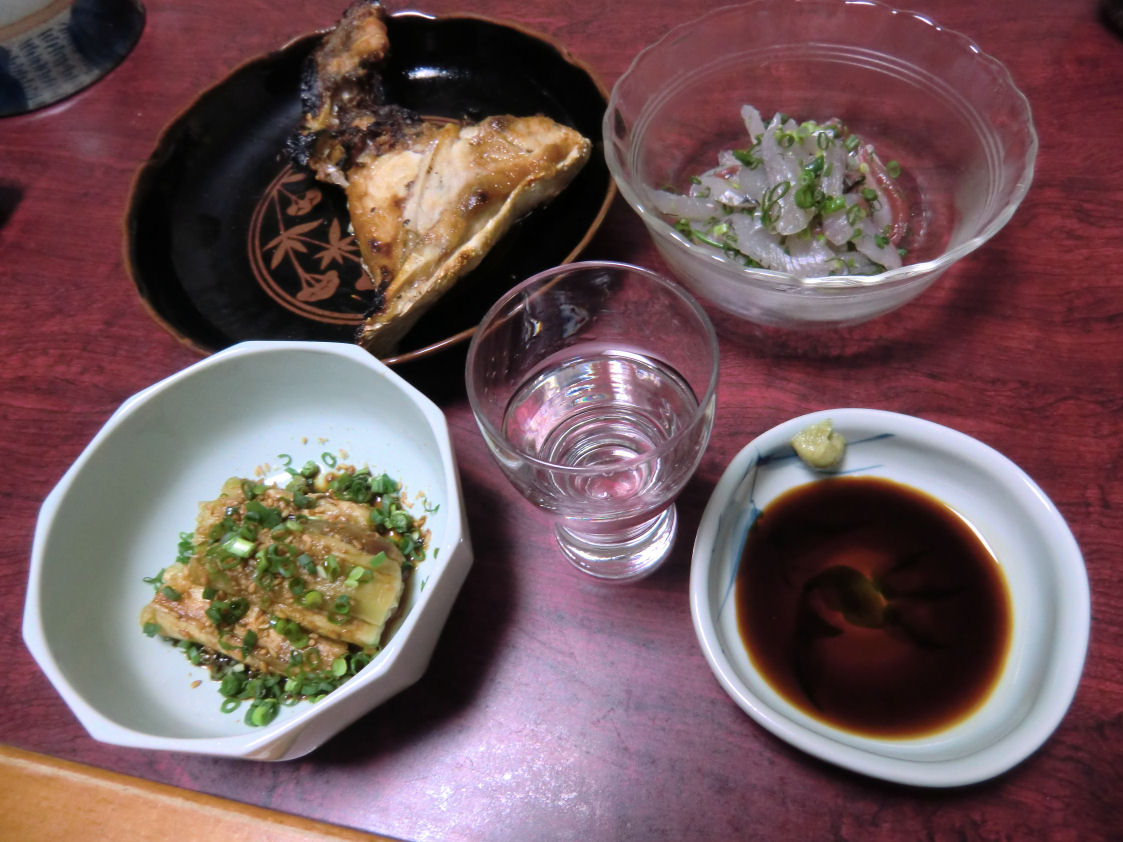 トビウオの刺身と、ブリのカマと、焼ナスでした。