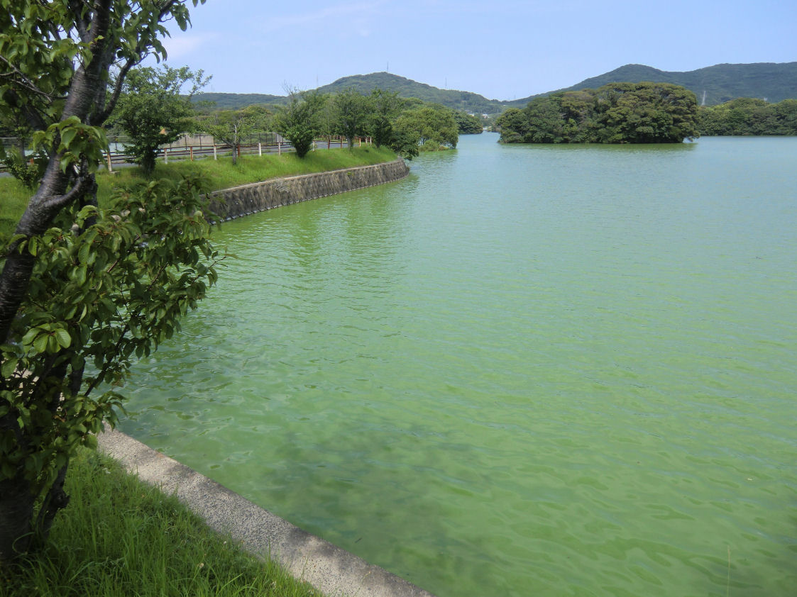 近くの貯水池に行ったらおかしな水の色をしていました。