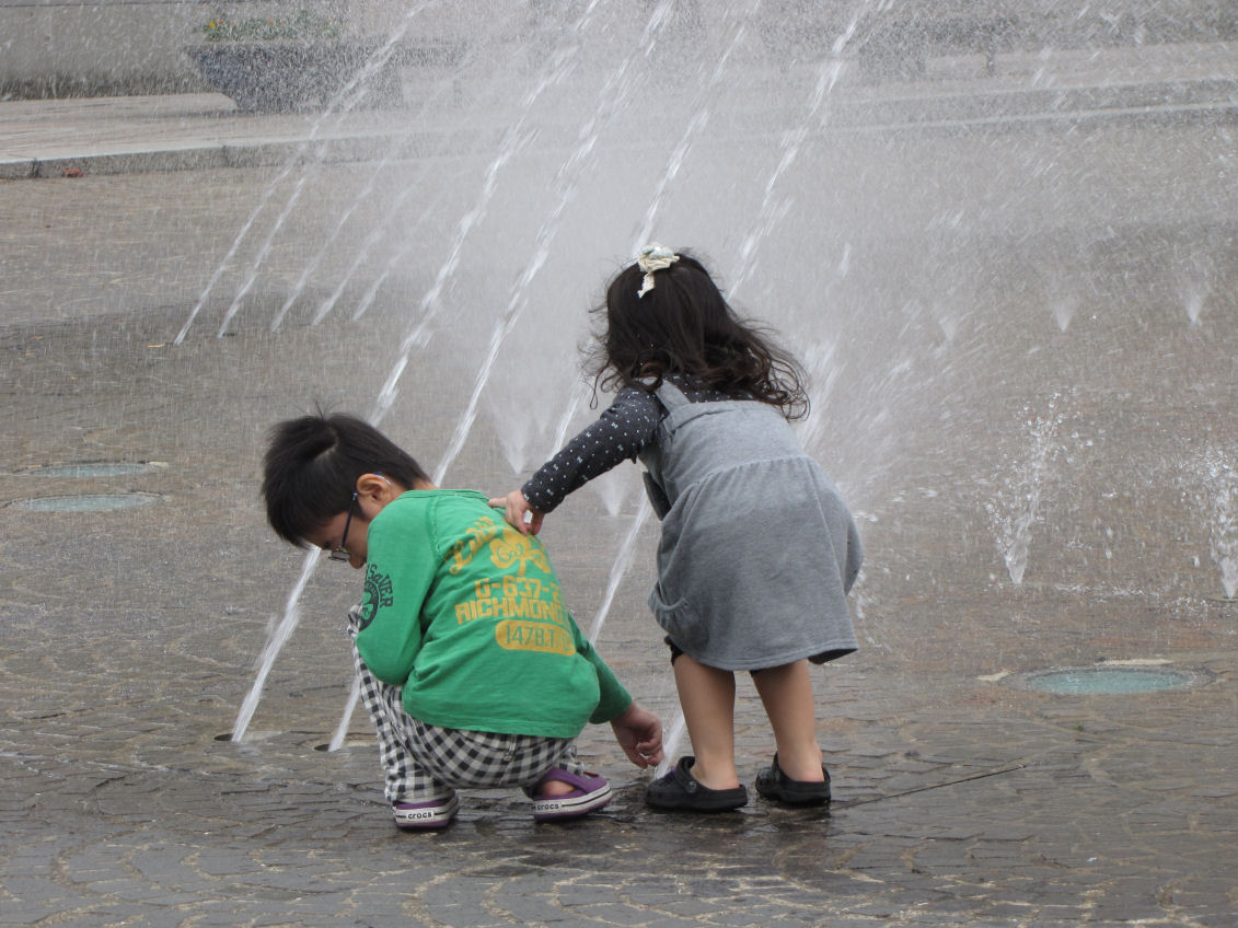 門司港駅の前には噴水がありますが、子供は水遊びが好きですねぇ。