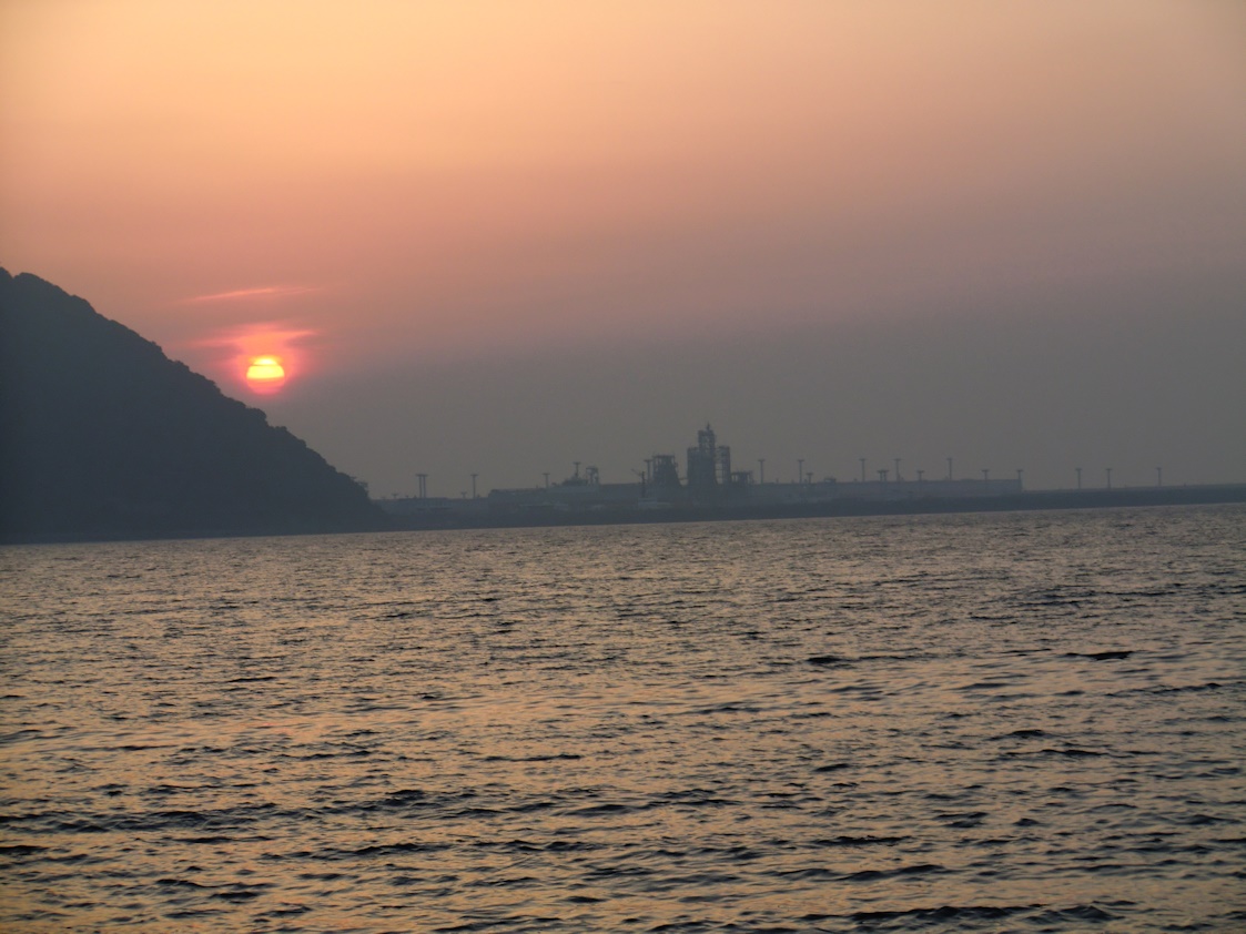 正面に男島の石油備蓄基地から昇る朝日を拝んで釣り開始です。