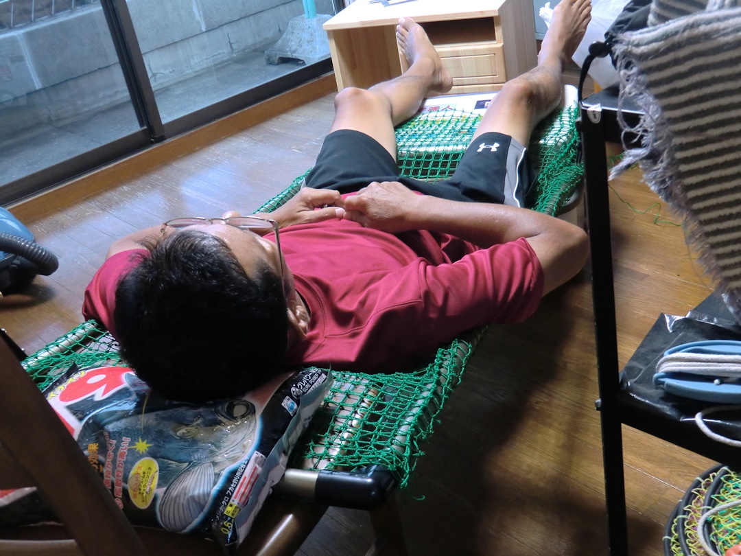 しかし海辺は風が少し強いので釣りには行けず、部屋で夜釣りの時の仮眠用のハンモックを作っていました。
