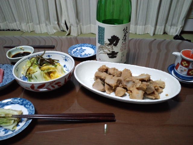 里芋の煮っ転がしと白菜の漬け物でやっています。