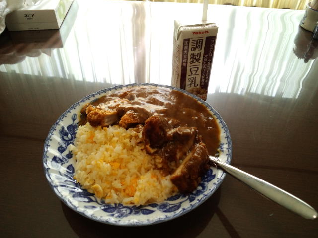 今日の昼飯は玉子ライスでカツカレーです。