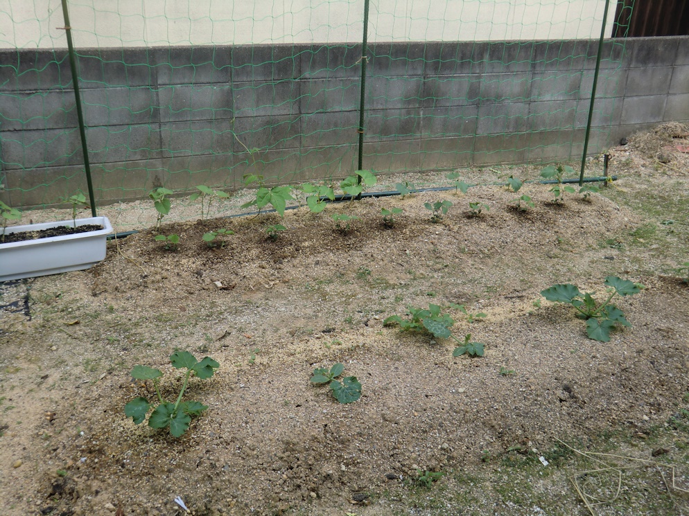 奥がインゲン豆とキュウリと枝豆で、手前はズッキーニです。