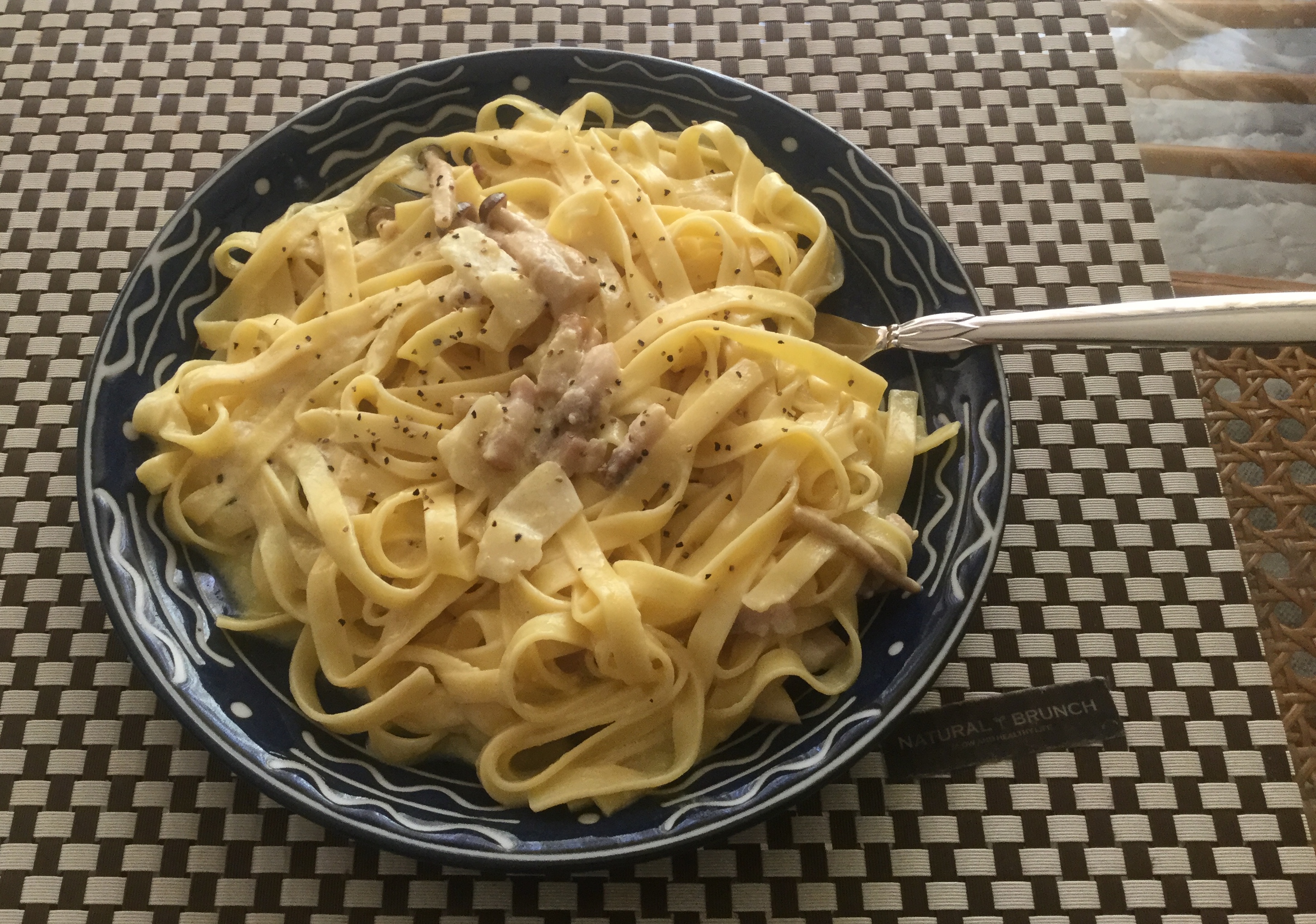 今日は平麺でカルボナーラでした。
