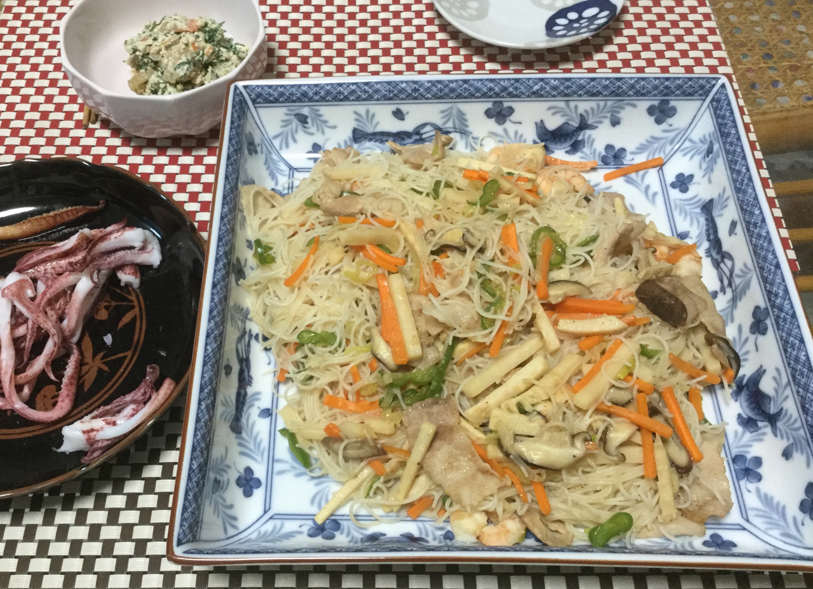 イカばかりでは飽きるので、今日は焼ビーフンです。