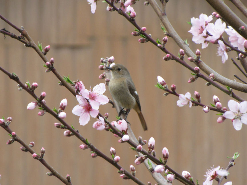 次に桃の木にも一羽とまってくれました、こちらも同じ鳥のように思います、ウグイスのようにも見えますが羽の白いところが気になります。