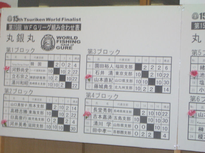 と 云う風になっております。私は、丸銀丸の3組で戦いました、花が付いている人が9日のトーナメントに進んだ人たちです。
