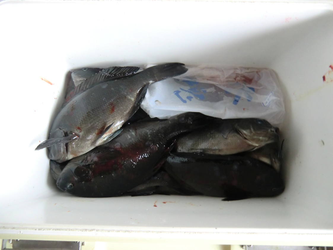 2時を過ぎると手のひら強のイサキが餌を取るようになり、4時が回収でしたが2時30分には片づけて船を待ちました。