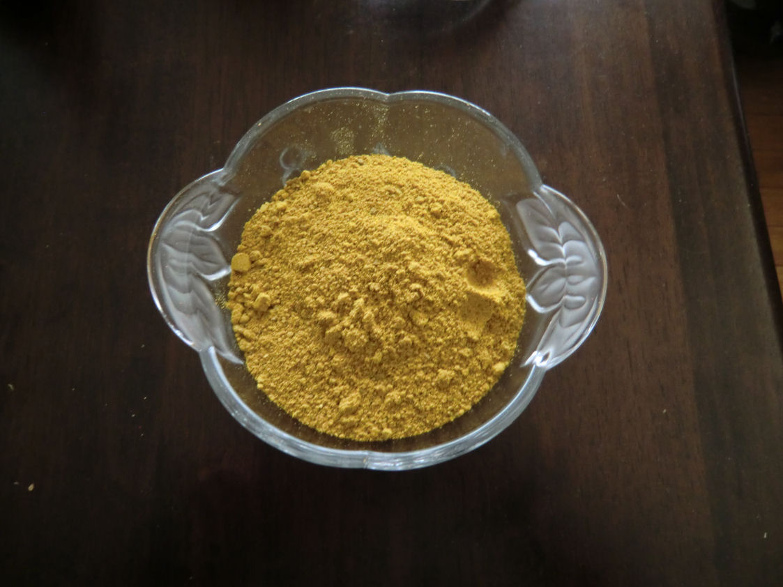もう10年位前になるでしょうか、日曜朝市でウコンの苗を買って植えたところ、たくさん収穫でき焼酎に漬けてそのままになっていたんですが、去年の年末に引っ張り出して飲み始めたところ何となく体の調子がいいので、ウコンを取り出して天日に乾して粉末にして見ました。