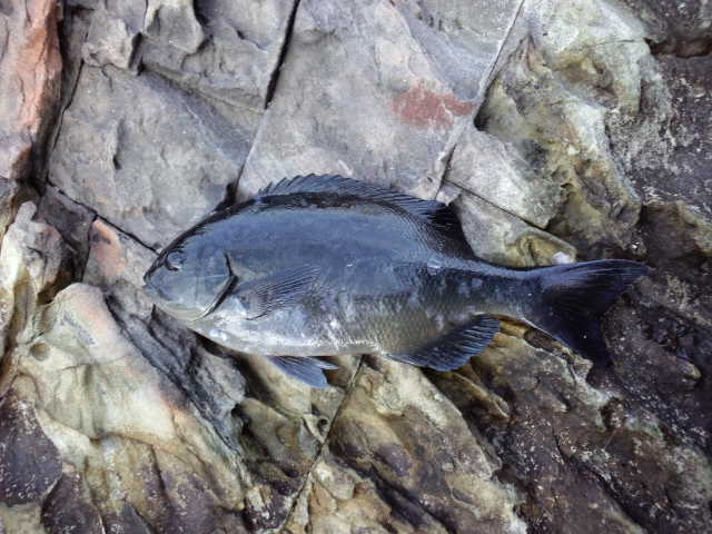 2匹目は35cmの尾長でタモが届かず波に乗せて上の段までずり上げて、そこから斜面を引きずり上げようとしたらハリスが切れて危うく逃げられる所でしたが、慌ててタモで押さえて波が来た時にうまくタモの中に納まってくれました。