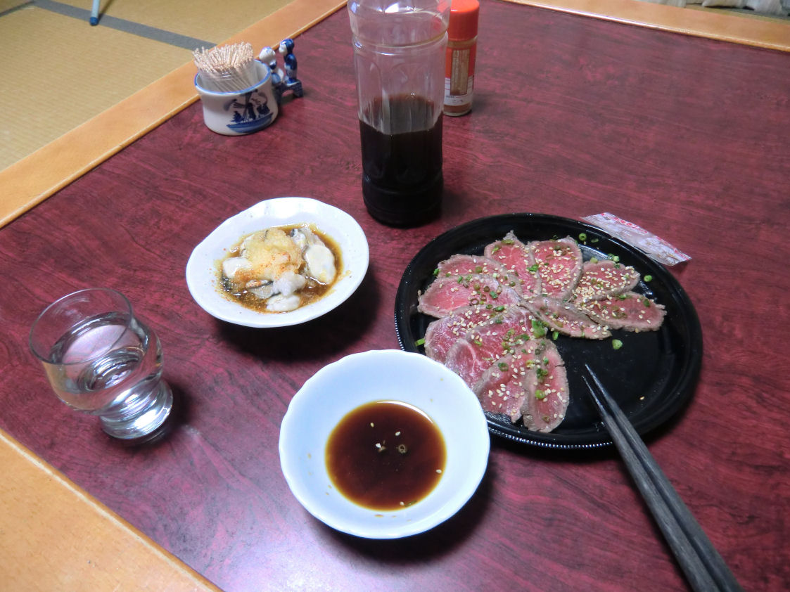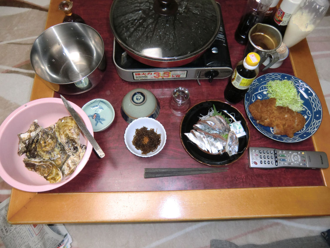 牡蛎の蒸し焼きに、アジの刺身にとんかつです。