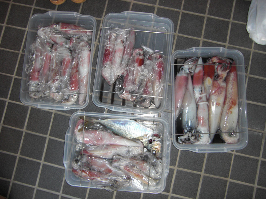 それで釣果のほうは明るいうちにやったアジ釣りで40cmのアジが1匹と、イカは胴長30cmを頭に30杯ほど