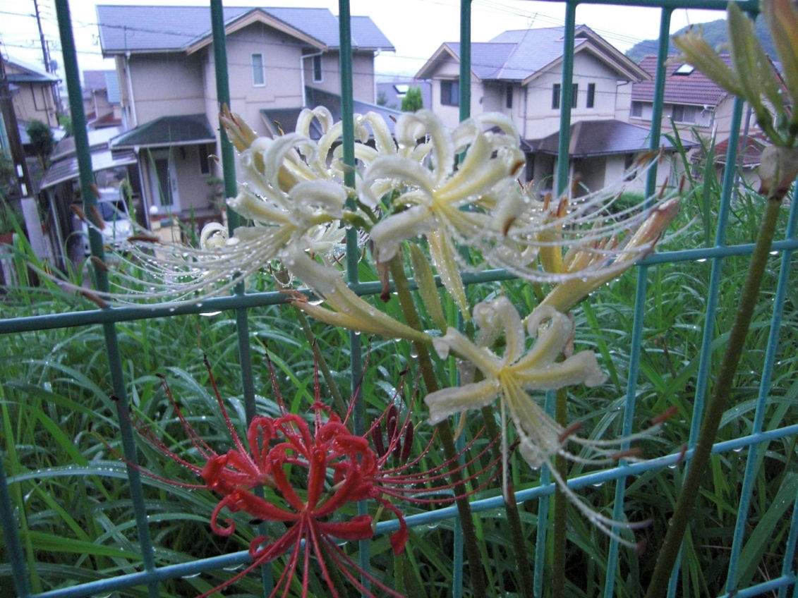 の白いほうはシロバナマンジュシャゲ(白花曼珠沙華)といって、ヒガンバナとショウキスイセンの自然交配種のようです。彼岸花とは赤い花だけをさすようです。