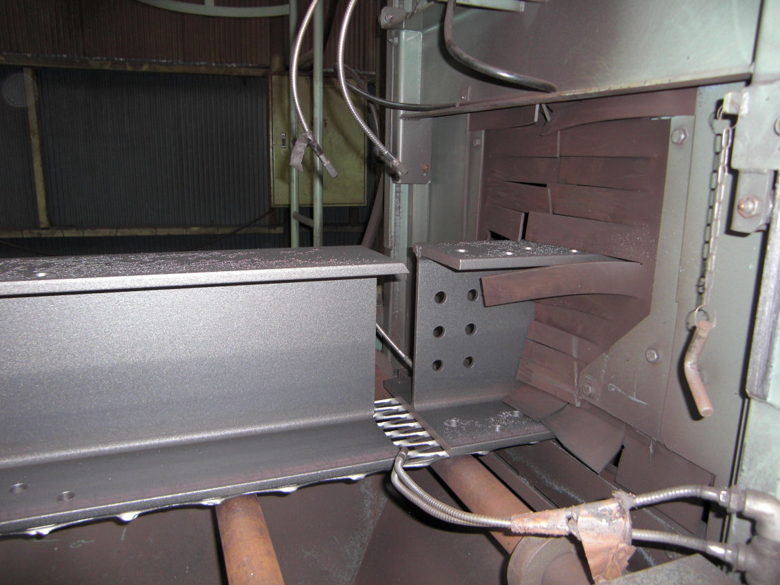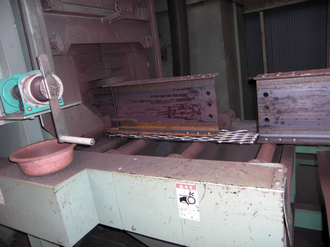 ショットブラストと言って、1.5mmくらいの小さな鋼の玉を高圧のエアーで吹き付けて、錆や圧延の時に出来る黒皮などを落とします。