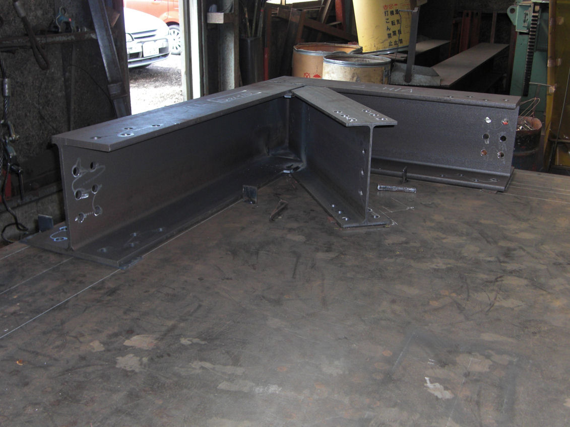 溶接が終わったところです。 軟鋼や高張力の素材のものは炭酸ガスを使った半自動溶接が主流のようです。 手前のやつは検査が終わり黄色のチョークでOKのマークが付いています、溶接のところが濡れているのは検査の時に塗るグリセリンです。この後寸法などの検査をして、今度は発注もとの検査を受けてやっと完成です。