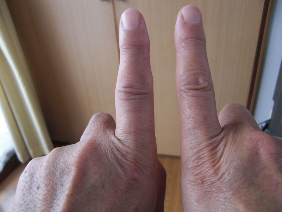 左の人差し指がはれています。 1ヶ月くらい前に仕事中にハンマーでたたいて、まだ指を曲げると痛みが走ります。