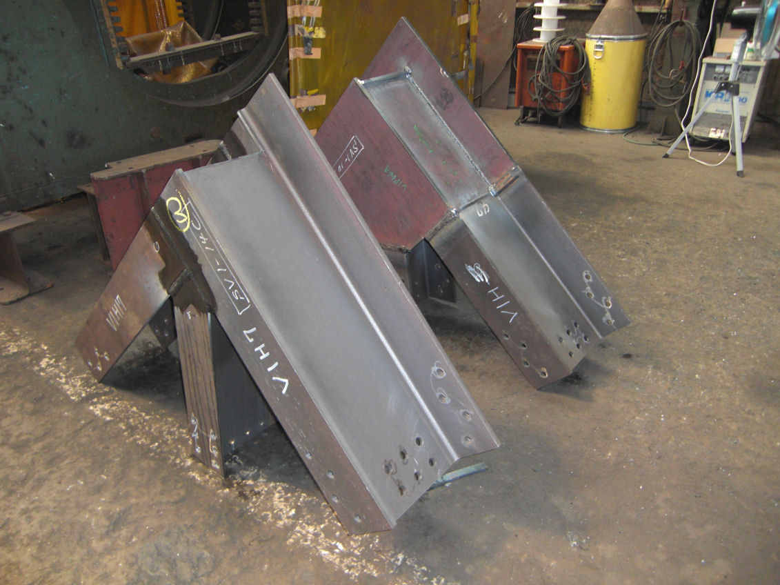溶接が終わったところです。 軟鋼や高張力の素材のものは炭酸ガスを使った半自動溶接が主流のようです。 手前のやつは検査が終わり黄色のチョークでOKのマークが付いています、溶接のところが濡れているのは検査の時に塗るグリセリンです。この後寸法などの検査をして、今度は発注もとの検査を受けてやっと完成です。