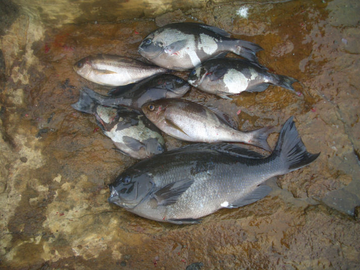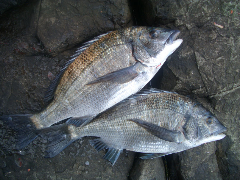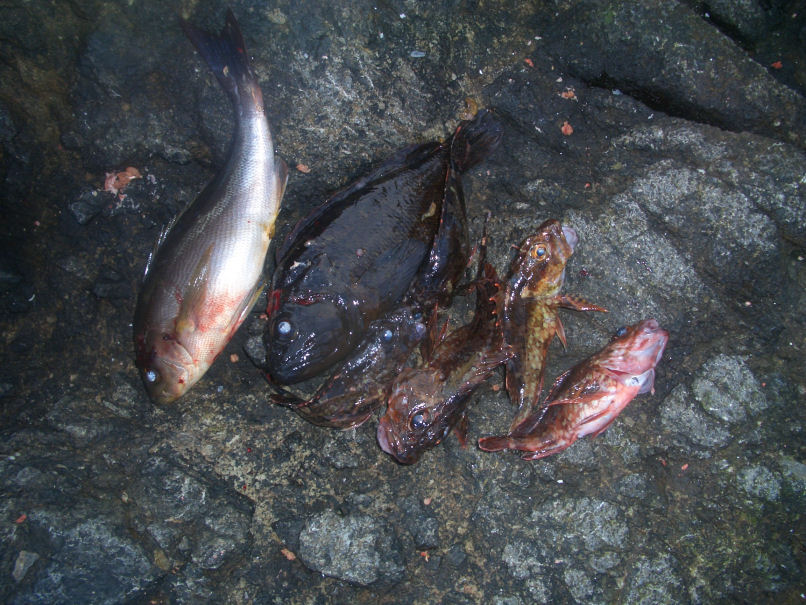 釣果のほうは明るいうちに足の裏から30cmのクロを数尾釣りあげ日が暮れて暫くは何も釣れません、その後30cmくらいのイサキを2尾釣って11時ごろ相棒のトモゾーが43センチくらいのクロを釣り上げたので場所をクロの本命ポイントに変わり、暫くして小さなアタリがあり合わせると生体反応はあるけど暴れたりせず重いだけで浮かせてから慌てたように逃げ回り始めました、ようやくタモに収め見てみると大きくてびっくりです、メジャーを当てると50cmはありそうです。 この後トモゾーが45cmのチヌを追加して朝までこれといったアタリも無くなり納竿です。