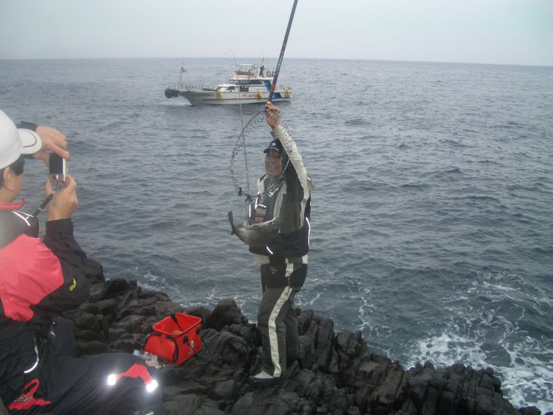 昨日は釣研の全遊動Xのキャンペーンに応募していたら当選したので参加してきました。 長崎県は平戸の宮之浦で池永祐二名人を講師に招いて講習会も有りました。 最初は上阿値賀島の西のハナから少し北のハナの方に行った瀬で講習会が8時まであり、池永名人の釣りを見学です、最初は宮之浦名物の餌取のスズメダイのあまりの多さにツケ餌がもたない状況が続いていましたが、8時が近づくにつれまずベラが2回釣れてだんだんツケ餌が残ってきて、次は釣れるよの言葉どうりとうとうやりました、でも上がってきたのはウマヅラハギです、いよいよ8時になり最後の一投でした絶対に喰ってくると言って迎えの船が来ると同時に合わせが入り見事チヌを釣り上げました。 あのすごい数の餌とりの交わし方は勉強になりました、この後すぐ横の裏の瀬という瀬に上がり見事45cmのチヌを2尾釣り上げることが出来ました。