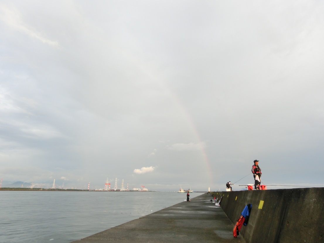 ゆっくりと準備を済ませ釣り開始の頃にはすっかり夜も明けて、空にはこんな虹も出て薄日が差すまでの天気になりました。