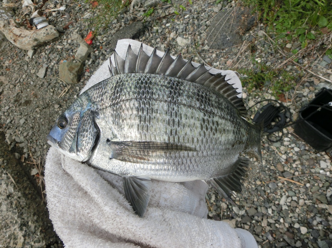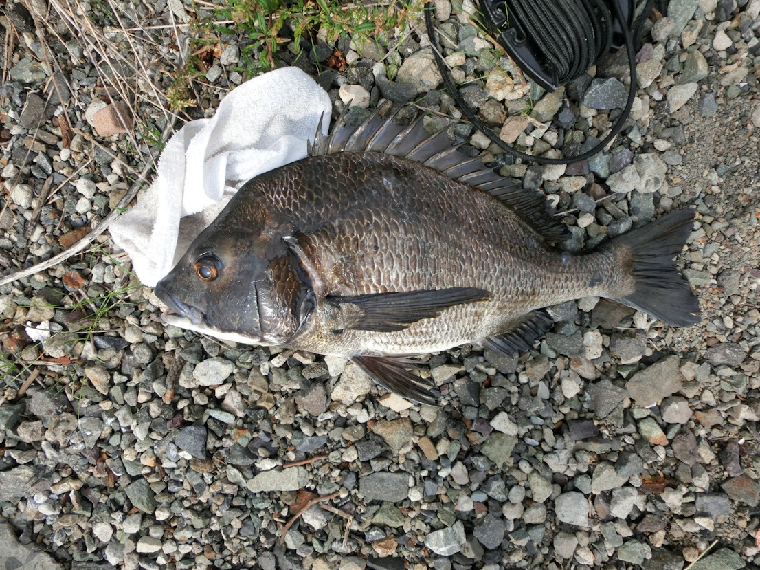 道糸1.35号、ハリスは1.2号なので慎重にやり取りをしてタモに納めたのは紛れもなく大型のチヌでした。