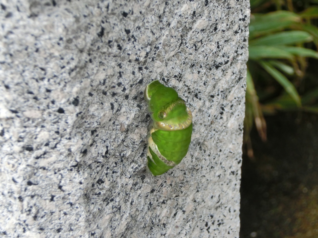 玄関前の塀でさなぎになっていました。