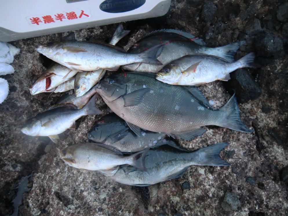 結果 今日の釣果は45㎝を頭に尾長グロが3匹と口太クロが1匹、そして35㎝を頭にイサキが7匹と私にしてみれば出来過ぎた釣果でした。