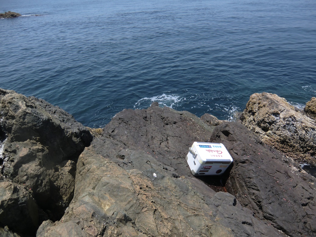 クーラーの先が釣り座ですが、斜めになっている上に滑りやすい足場で結構疲れました。